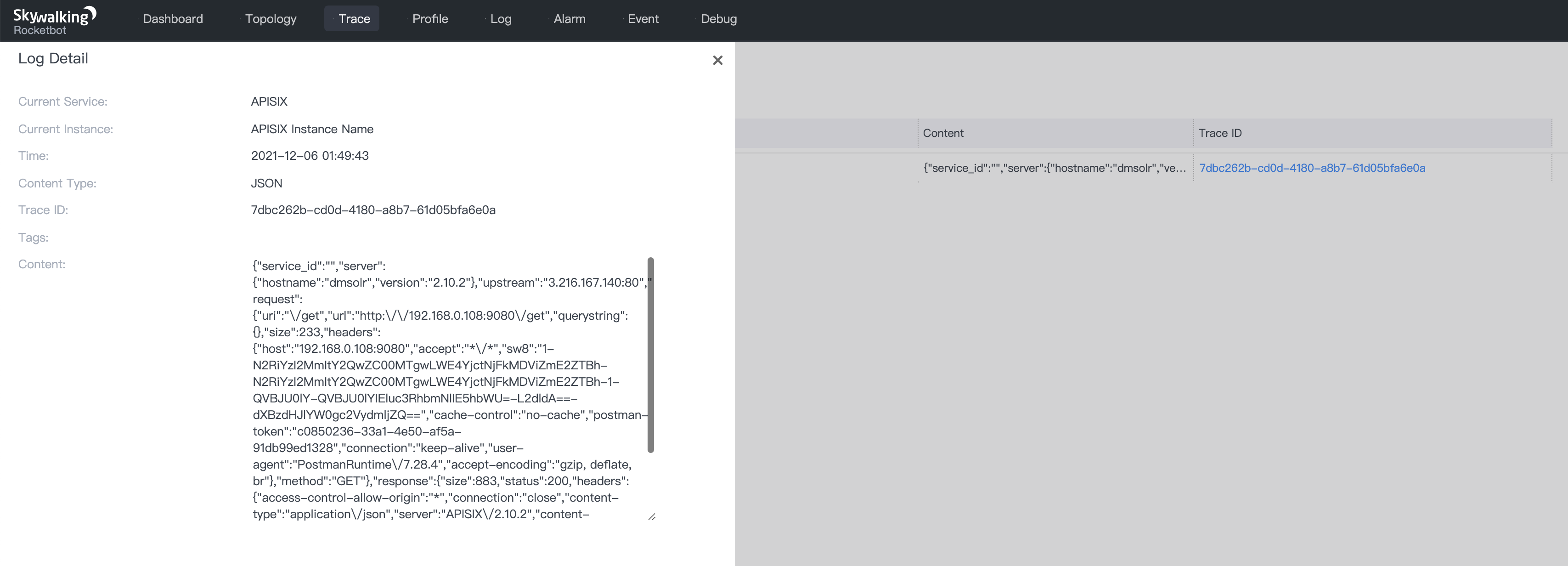Then you can use the SkyWalking Tracing plug-in to get the tracing data directly, so you can verify that the Logging plug-in-related features are enabled and working properly.